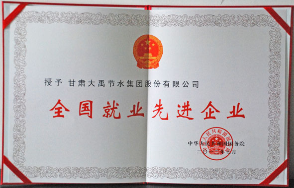 7月17日,全国就业创业先进表彰大会在北京人民大会堂隆重举行,甘肃大禹节水集团股份有限公司被授予“全国就业先进企业”荣誉称号。据悉,甘肃省内共有5家企业荣获该项殊荣。